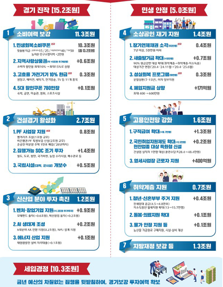 기획재정부에 따르면 이번 추경은 ▲경기 진작 15조 2,000억 원 ▲민생 안정 5조 원 ▲세입경정 10조 3,000억 원으로 구성됐다. 정부는 경기 부양과 취약계층 지원을 위한 20조 2,000억 원의 지출 확대를 단행했으며, 국채 발행은 최소화한다는 방침이다.