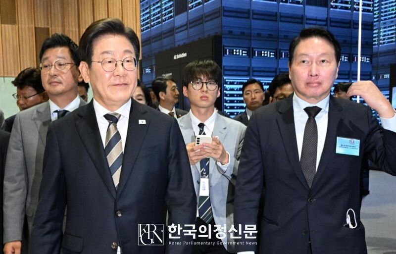 이재명 대통령이 20일 울산전시컨벤션센터에서 열린 ‘울산 인공지능(AI) 데이터센터’ 출범식에 최태원 SK 그룹회장(오른쪽) 등과 함께 참석하며, AI 시대의 고속도로를 지방에서부터 구축하겠다는 비전을 선포했다. 사진=대통령실기자단