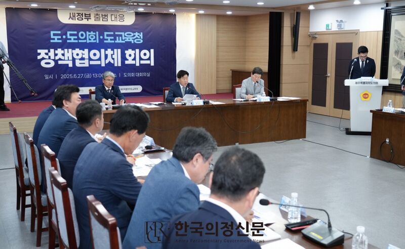 제주도는 6월 27일 도의회 대회의실에서 ‘새정부 출범 대응 정책협의체 회의’를 열고, 도와 교육청이 발굴한 총 72건의 정책 과제를 공유하고 대응 방안을 논의했다. 이 회의에는 오영훈 제주도지사, 이상봉 도의회 의장, 김광수 도교육감을 비롯한 세 기관의 주요 관계자들이 참석했다.