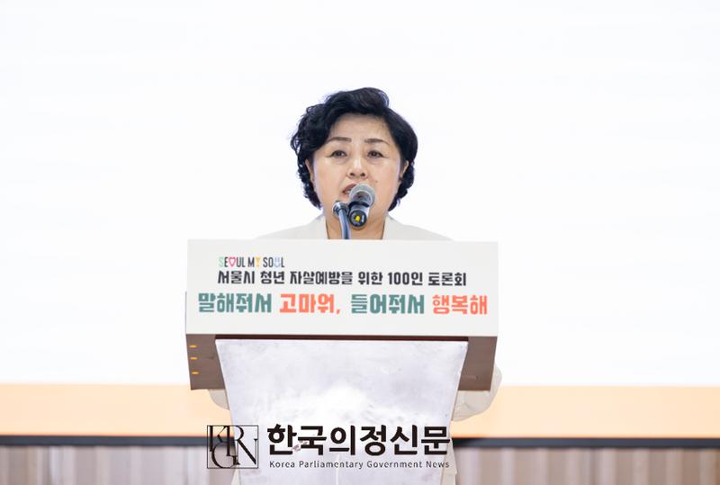 김영옥 의원이 지난 4일 열린 '서울시 청년 자살예방을 위한 100인 토론회'에 참석하여 축사를 하고 있다. 사진=서울특별시의회