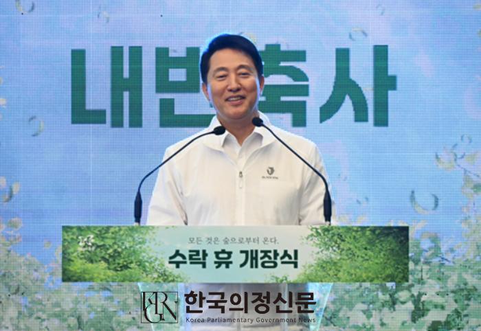 오세훈 서울시장이 서울시 첫 자연휴양림 '수락 휴' 개장식에서 축사를 하고 있다. 사진=서울시