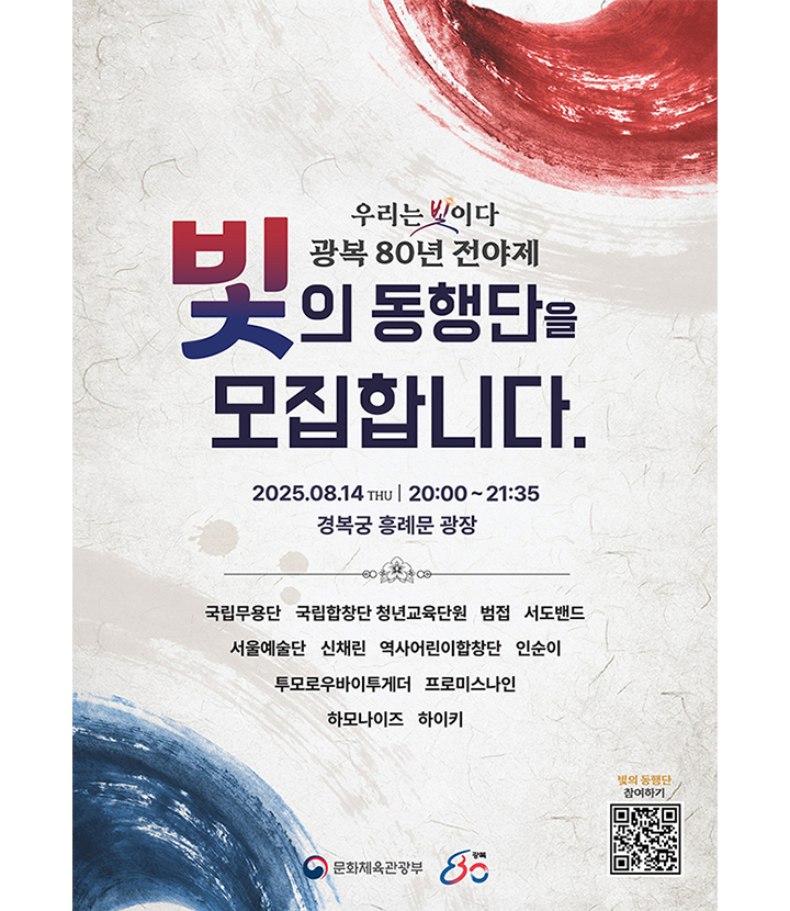이번 전야제는 사전 신청을 통해 누구나 참여할 수 있다. 문체부 공식 누리집(https://www.mcst.go.kr)이나 ‘광복 80년 기념사업추진위원회’ 누리집(https://www.korea815.go.kr)을 통해 7일까지 신청할 수 있으며, 동반 1인까지 등록이 가능하다.