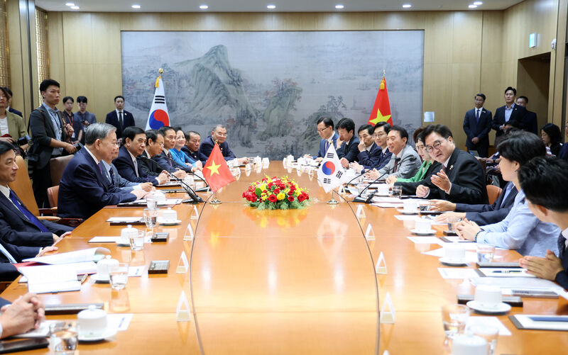 우원식 국회의장은 12일 오후 국회 접견실에서 또 럼(To Lam) 베트남 공산당 서기장을 만나 양국 간 교역·투자 활성화, 대규모 인프라 프로젝트 참여, 과학기술 협력, 인적 교류 확대 방안 등에 대해 폭넓게 논의했다.