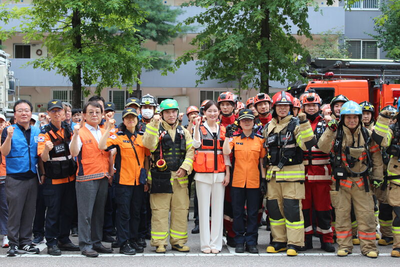 서울시의회 김혜지 의원이 강동소방서와 함께 진행된 ‘소방차 길 터주기’ 및 아파트 화재 진압 합동 훈련에 참여해 소방대원, 의용소방대, 관계자들과 기념촬영을 하고 있다. 사진=서울시의회