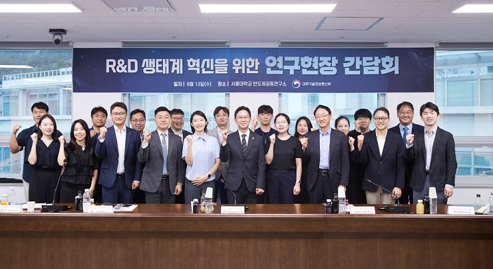 배경훈 과학기술정보통신부 장관이 지난 13일 오전 서울 관악구 서울대학교 반도체공동연구소에서 열린 'R&D 생태계 혁신을 위한 연구현장 간담회' 에서 연구자들과 '연구개발 생태계 혁신방안' 관련 의견을 나누고 있다. 사진=과기정통부 제공