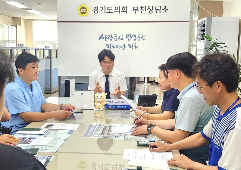 경기도의회 박상현 의원(가운데)이 26일 부천상담소에서 부천시의회 구점자·손준기 시의원과 시 관계 공무원들과 함께 택시복지센터 주변 주차난 해소 방안을 논의하고 있다. 사진=경기도의회