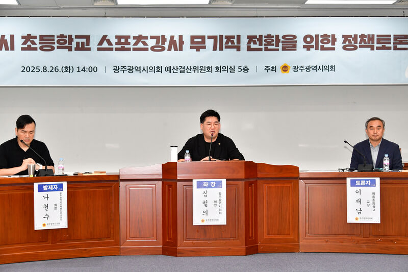 광주광역시의회 심철의 의원(더불어민주당·서구4)은 8월 26일 시의회 예산결산특별위원회 회의실에서 「광주광역시 교육청 초등학교 스포츠강사 무기계약직 전환을 위한 정책토론회」를 좌장으로 주재하며, 초등학교 스포츠강사의 고용안정과 체육교육의 지속 가능성을 모색했다.