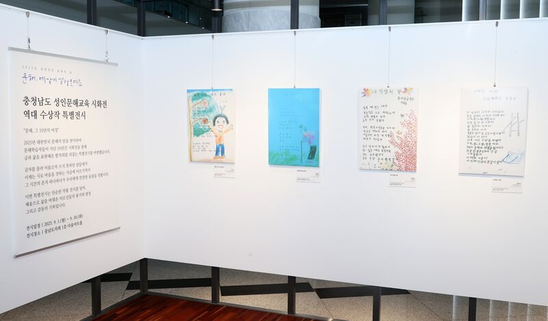 충남도의회(의장 홍성현)가 성인문해교육의 가치를 널리 알리기 위한 뜻깊은 전시회를 열었다. 도의회는 9월 1일부터 30일까지 한 달간 도의회 1층 ‘다움아트홀’에서 「역대 충남 성인문해교육 시화전 수상작 특별전」을 개최한다고 밝혔다.