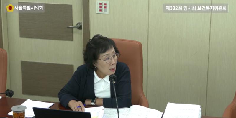 서울특별시의회 제332회 임시회 보건복지위원회 회의에서 신복자 의원(국민의힘, 동대문4)이 학대피해장애인 쉼터 리모델링 공사의 부실 문제와 운영 실태를 지적하며 질의하고 있다. 사진=서울특별시의회