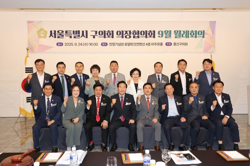 서울특별시 용산구의회(의장 김성철)가 9월 24일 전쟁기념관 로얄파크컨벤션에서 서울특별시 구의회 의장협의회 9월 월례회의를 성황리에 개최했다. 이번 회의는 서울시 자치분권 강화와 지방의회 의정 발전 방안을 논의하기 위해 마련된 자리로, 김성철 용산구의장을 비롯해 조동탁 강동구의장(협의회장)과 서울시 17개 구의회 의장, 용산구의회 의원, 박희영 용산구청장 등이 함께 참석했다.