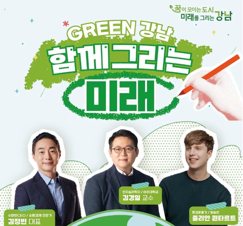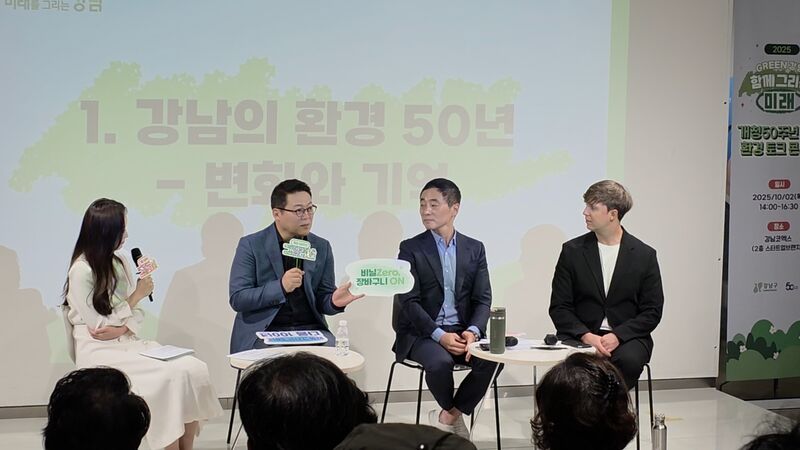 2부 토크콘서트에는 인지심리학자 김경일 아주대학교 교수, 방송인 겸 환경운동가 줄리안 퀸타르트, 순환경제 스타트업 ㈜수퍼빈 김정빈 대표가 패널로 참여했다. 세 사람은 ▲강남의 환경 50년과 도시 변화 ▲시민 실천과 녹색생활 문화 ▲국제적 관점에서 본 다양성과 환경 협력 ▲그린 혁신과 정책의 방향 ▲일상 속 실천의 연결 등 여섯 가지 주제를 중심으로 입체적인 대담을 펼쳤다. 특히 생활습관 전환 전략과 데이터 기반 자원순환, 민관·산학 협력 사례를 공유하며 ‘듣고 공감–현장 적용’으로 이어지는 실천 경로를 제안했다.