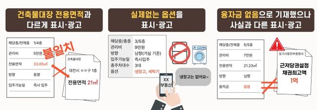 위반유형을 살펴보면 ‘부당한 표시·광고’가 166건(51.7%)으로 가장 많았다. 대표적인 사례로는 ▲전용면적을 실제보다 넓게 기재 ▲존재하지 않는 옵션(에어컨·냉장고 등) 포함 ▲융자금이 없다고 속이거나 근저당권을 숨긴 경우 등이 적발됐다.