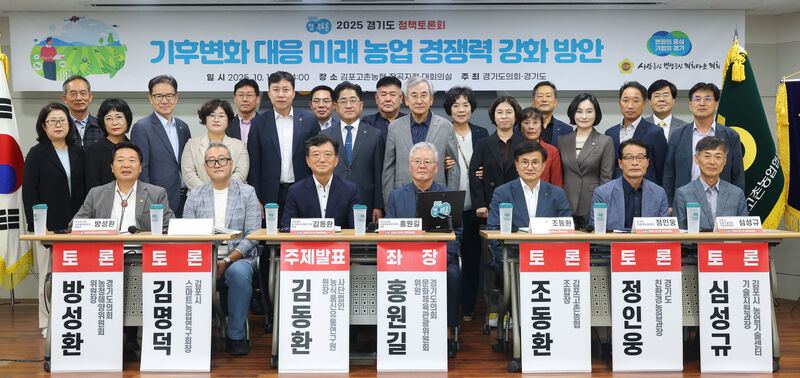 경기도의회 문화체육관광위원회 홍원길 의원(국민의힘, 김포1)이 좌장을 맡은 ‘기후변화 대응 미래 농업 경쟁력 강화 방안’ 정책토론회가 지난 10월 1일 김포고촌농협 장곡지점 대회의실에서 열렸다. 이번 토론회는 경기도와 경기도의회가 공동 주최한 ‘2025 경기도 정책토론회’의 일환으로, 기후변화로 인한 농업 환경 변화에 대응하고 지속 가능한 미래 농업의 경쟁력 확보를 위한 다양한 방안을 모색하기 위해 마련됐다.
