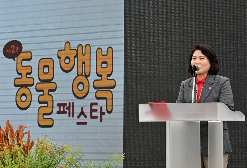 서울특별시의회 환경수자원위원회 박춘선 부위원장(국민의힘, 강동3)이 제2회 ‘서울 동물행복페스타’ 개막식에서 축사를 전하며 시민들과 반려동물 가족들에게 따뜻한 격려의 말을 전하고 있다. 사진=서울시의회 제공