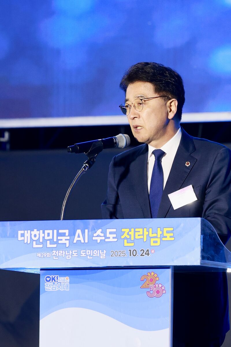 전라남도의회 김태균 의장이 24일 전남 OK도민광장에서 열린 ‘제29회 전라남도 도민의 날 기념식’에 참석해 축사를 하고 있다. 사진=전라남도의회