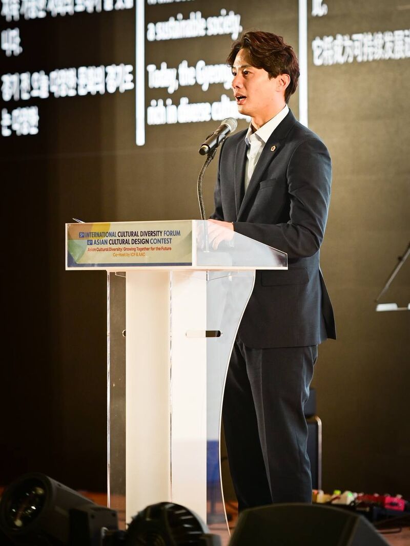 경기도의회 황대호 문화체육관광위원장이 경기아트센터에서 열린 ‘제5회 국제문화다양성포럼’에서 K-컬처 기반 지방문화외교의 중요성을 강조하며 축사를 하고 있다. 사진=경기도의회