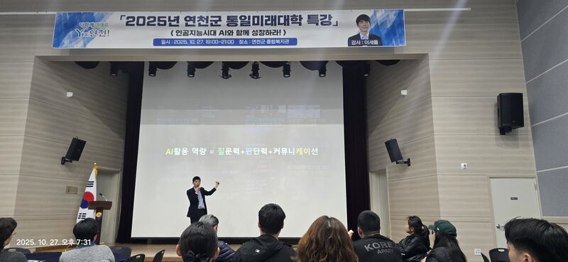 연천군은 10월 27일, 연천군종합복지관 대강당에서 ‘인공지능 시대, AI와 함께 성장하라’를 주제로 제10회 연천통일미래대학 특별강연을 개최했다. 이번 강연은 인공지능 시대를 살아가는 군민들에게 기술 변화의 흐름을 이해하고, 인간 중심의 미래 방향을 모색하기 위한 취지로 마련됐다.