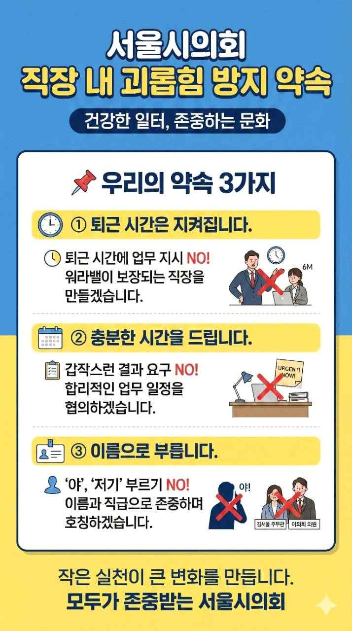 직원들이 안전하게 일할 수 있는 근무환경은 의회의 정책 역량과 전문성을 높이는 핵심 기반으로 평가된다. 이러한 조직문화 개선 시도는 지방의회가 신뢰받는 의회로 나아가기 위한 중요한 흐름으로, 향후 지속적 확산이 요구된다.