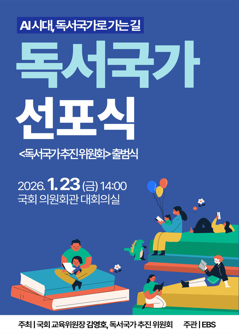 김 위원장은 국회·정부·교육계·지자체·민간이 함께 참여하는 범사회적 연대체인 「독서국가 추진 위원회」를 발족하고, 오는 2026년 1월 23일 국회의원회관 대회의실에서 ‘AI 시대, 독서국가로 가는 길’을 주제로 출범식과 독서국가 선포식을 개최한다. 이날 행사에는 약 1,000명이 참석할 예정이며, 공영교육방송 EBS가 주관 방송을 맡는다.