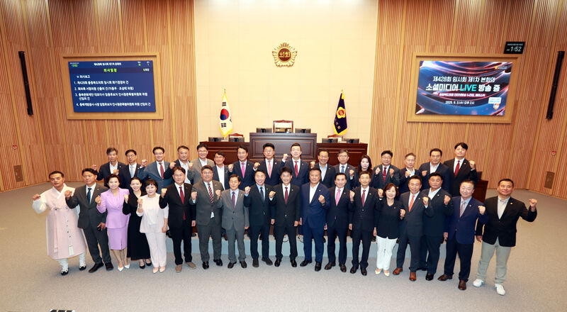 충북도의회 본회의장에서 제430회 정례회 종료 후 의원들이 함께 기념촬영을 하고 있다. 사진제공=충청북도의회