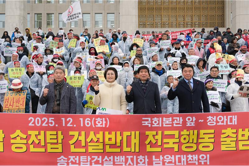 남원시의회(의장 김영태)가 초고압 송전선로 건설에 반대하며 국회 앞에서 강력한 목소리를 냈다. 남원시의회는 지난 16일 국회 앞에서 열린 ‘용인 반도체 국가산업단지 재검토와 초고압 송전탑 건설 반대 전국행동’ 출범식 및 기자회견에 참석해, 초고압 송전선로 건설의 전면 백지화를 촉구했다.
