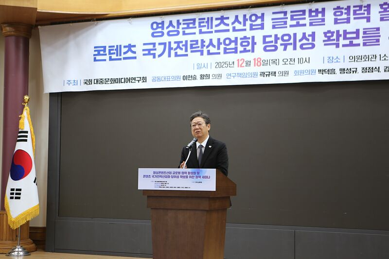 황희 국회의원이 국회에서 열린 ‘영상콘텐츠산업 글로벌 협력 활성화 및 콘텐츠 국가전략산업화 당위성 확보를 위한 정책 세미나’에서 개회사를 하고 있다. 사진=황희 의원실