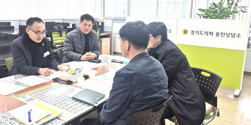 김영민 경기도의회 건설교통위원회 의원이 1월 14일 경기도의회 용인상담소에서 경기도 건설국 하천과 관계자들과 함께 용인지역 지방하천 정비 및 유지관리사업 추진계획과 예산 집행 현황을 점검하고 있다. 사진=경기도의회