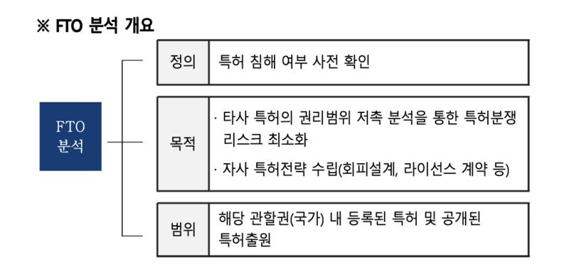 FTO 분석은 제3자 또는 타 기업이 보유한 특허를 침해하지 않으면서 기술·제품·공정을 구현할 수 있는지를 사전에 검토하는 절차로, 특허 분쟁을 예방하는 핵심 수단이다. 특히 생산 중단이나 대규모 손해배상으로 이어질 수 있는 특허침해 분쟁의 특성상, 사후 대응보다는 사전 분석이 기업 생존에 결정적인 역할을 한다는 평가다.
