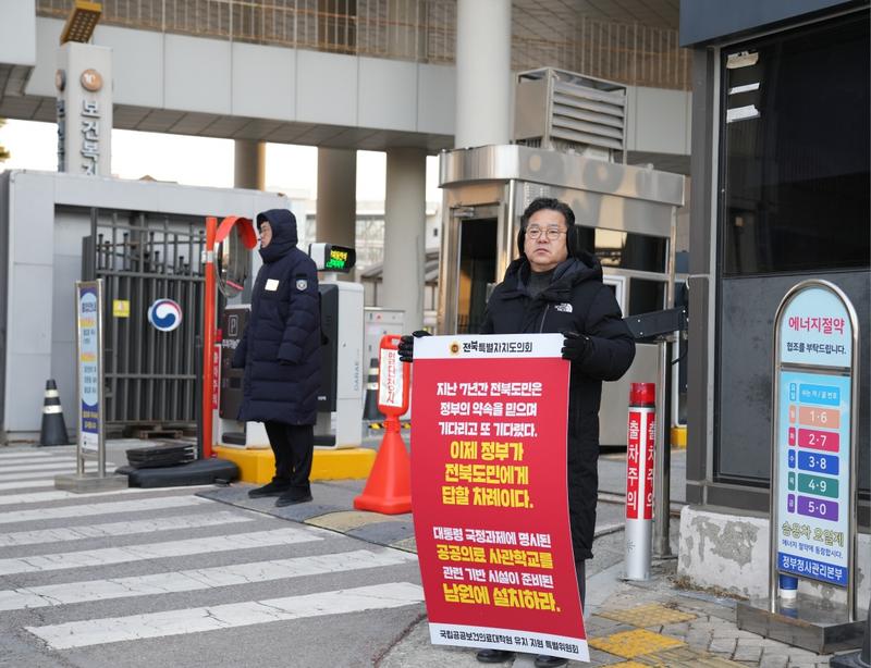 전북특별자치도의회 국립공공보건의료대학원 유치 지원 특별위원회 이정린 위원장(남원1)과 임종명 의원(남원2)이 20일 아침 출근길에 세종시 보건복지부를 찾아 남원 국립의학전문대학원 설립을 촉구하는 1인 시위에 나섰다. 이번 시위는 공공·필수의료 인력 부족으로 심각한 위기에 직면한 대한민국 의료체계의 현실을 정부에 직접 알리고, 국립의학전문대학원 설립이라는 근본적 대안의 조속한 추진을 요구하기 위해 마련됐다.