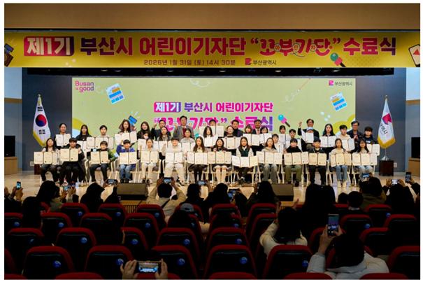 부산시가 지난 1년간 부산 곳곳을 누비며 도시의 일상과 변화를 기록해 온 ‘꼬마 기자들’의 성장을 축하하는 뜻깊은 자리를 마련했다. 부산시는 1월 31일 오후 시청 대강당에서 「제1기 부산시 어린이기자단(꼬마부산기자단) 수료식」을 개최했다고 밝혔다. 이날 행사에는 어린이기자와 학부모를 비롯해 시의회, 교육청 관계자 등 400여 명이 참석해 어린이기자단의 활동을 격려하고 그동안의 성과를 함께 나눴다.