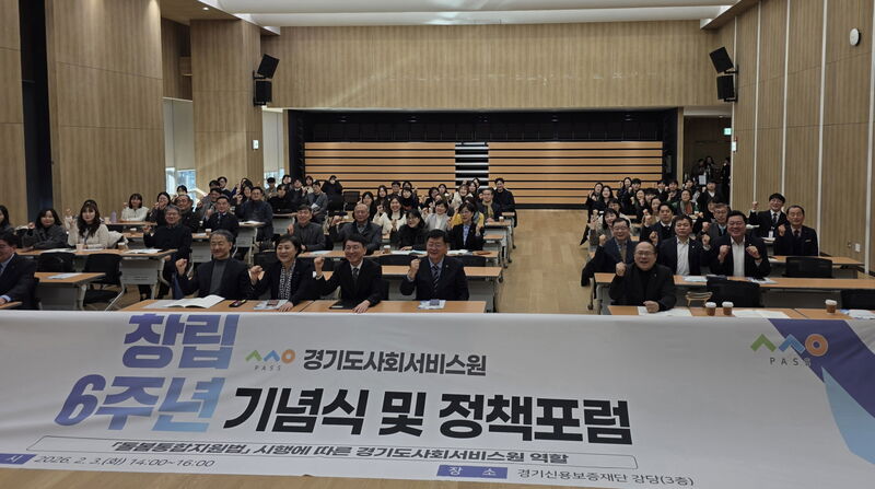경기도사회서비스원 창립 6주년 기념식 및 정책포럼에서 이선구 경기도의원을 비롯한 참석자들이 기념촬영을 하며 공공 돌봄 강화와 지역사회 통합돌봄 체계 확립 의지를 다지고 있다. 사진=경기도의회