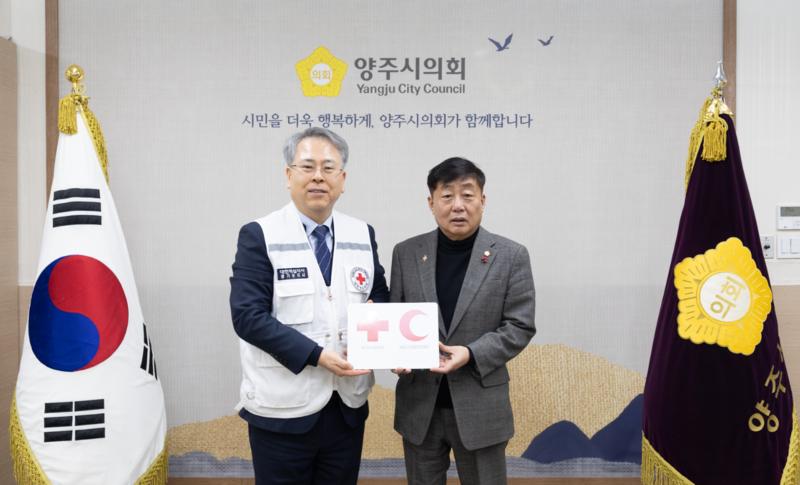 양주시의회 윤창철 의장은 29일 오후 양주시의회 의장실에서 대한적십자사 경기도지사 우광호 사무처장에게 ‘2026년 적십자 특별회비’를 전달하며, 인도주의적 나눔 활동에 대한 지속적인 협력 의지를 밝혔다.