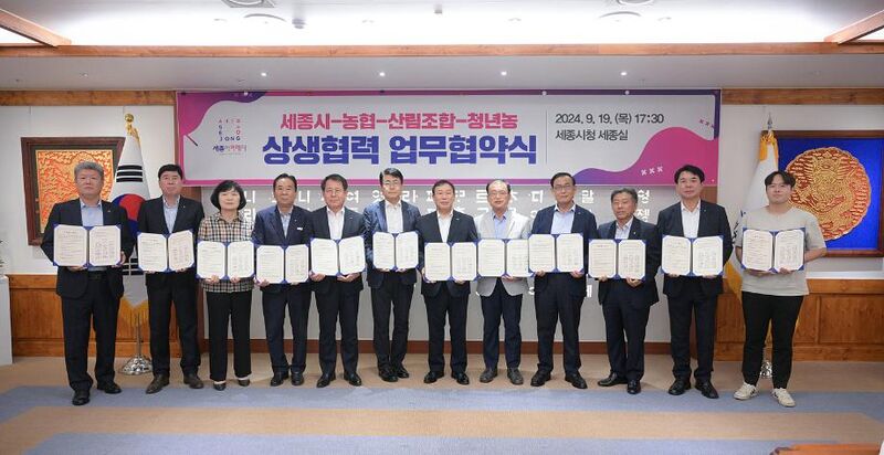 세종특별자치시(시장 최민호)가 19일 시청 세종실에서 농립업 분야 주요 기관 및 청년 농업인과 업무협약을 맺고 적극적인 시정 참여·협력을 통해 농촌지역의 지속가능한 발전에 힘을 모으기로 했다.