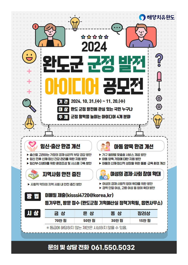 완도군에서는 군정 발전을 위해 '완도군 군정 발전 아이디어 공모전'을 2024년 10월 31일(수)부터 11월 20일(수)까지 실시한다고 밝혔다.