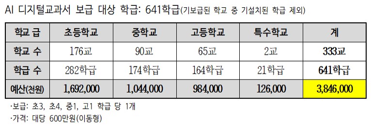 교육위원회는 “2025년부터 초등학교 3·4학년, 중학교 1학년, 고등학교 1학년 등 4개 학년에 AI 디지털 교과서가 도입됨에 따라, 해당 학년의 학급당 1대씩 전자칠판을 우선 지원하기로 했다”고 밝혔다.
