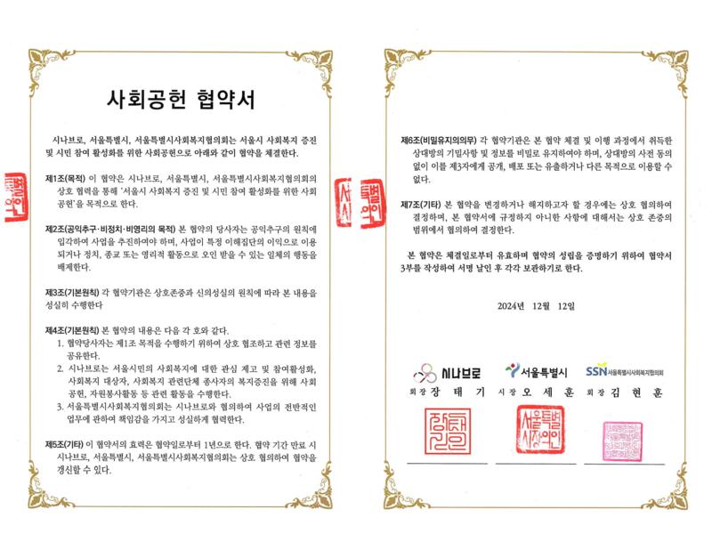 이날 시나브로 전문봉사단(단장 장태기)은 서울특별시 및 서울특별시사회복지협의회와 사회공헌 협약을 체결했다. 이번 협약을 통해 시나브로 봉사단은 서울시의 사회복지 증진과 시민 참여를 더욱 촉진하며, 시각장애인 및 뇌병변 청소년 지원, 환경 보호 활동, 문화·체험 프로그램 등 다양한 활동을 보다 체계적으로 확대할 계획이다.