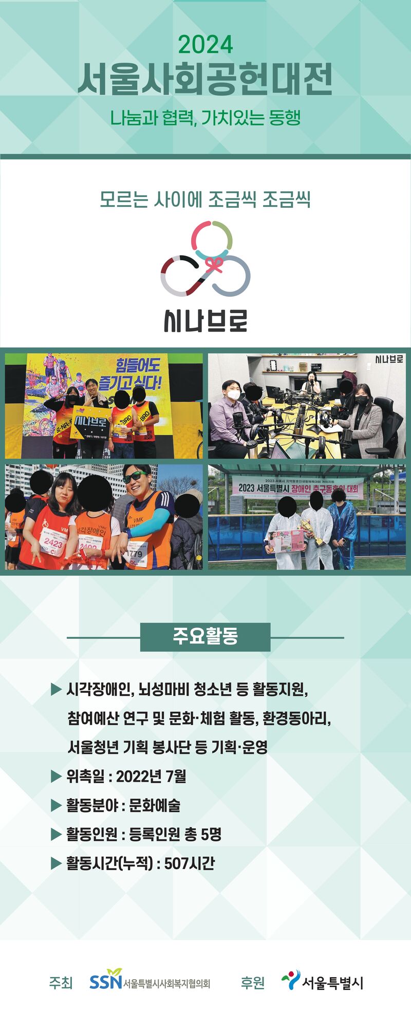 한편, 시나브로 전문봉사단은 2022년 서울특별시사회복지협의회 소속 단체로 위촉되어 활동을 시작했으며, 현재 장애인, 노인, 청소년 등 다양한 계층을 대상으로 스포츠 및 문화예술 프로그램을 운영하며 포용적인 지역사회를 만들기 위해 노력하고 있다.