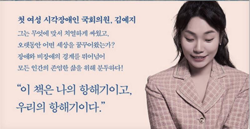 •김예지 의원은 1980년에 태어나 국립서울맹학교를 졸업한 후, 2004년 숙명여자대학교 음악대학에서 학사 과정을 마쳤습니다. 이후 미국 존스홉킨스대학교 피바디 음악대학원에서 피아노 전공으로 석사학위를 받고, 위스콘신대학교 매디슨 캠퍼스에서 피아노 연주 및 교수법으로 박사학위를 취득했습니다. 2015년부터 유니온 앙상블의 예술감독으로 활동했으며, 숙명여자대학교에서 피아노를 가르쳤습니다. 2019년에는 ‘올해의 장애인상’을 수상했으며, 2020년 미래한국당의 영입 인재 1호로 발탁되어 제21대 국회의원에 당선되었습니다. 현재 국민의힘 소속 국회의원으로 활동하고 있다. 2024년 김예지 의원의 저서 '어항을 깨고 바다로 간다'는 2023년 6월 14일 국회 대정부 질문 마무리 발언에서 유래했다. 당시 김 의원은 장애인을 비롯한 사회적 약자와 소수자들의 상황을 '코이'라는 물고기에 비유하며 주목을 받았다.