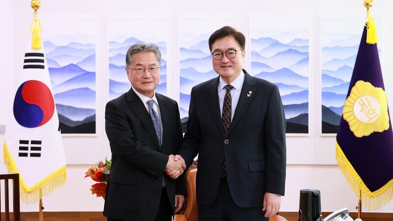우원식 국회의장이 18일(화) 오전 의장집무실에서 조셉 윤 주한미국대사대리와 반갑게 악수하고 있다. 사진=국회사무처 사진팀