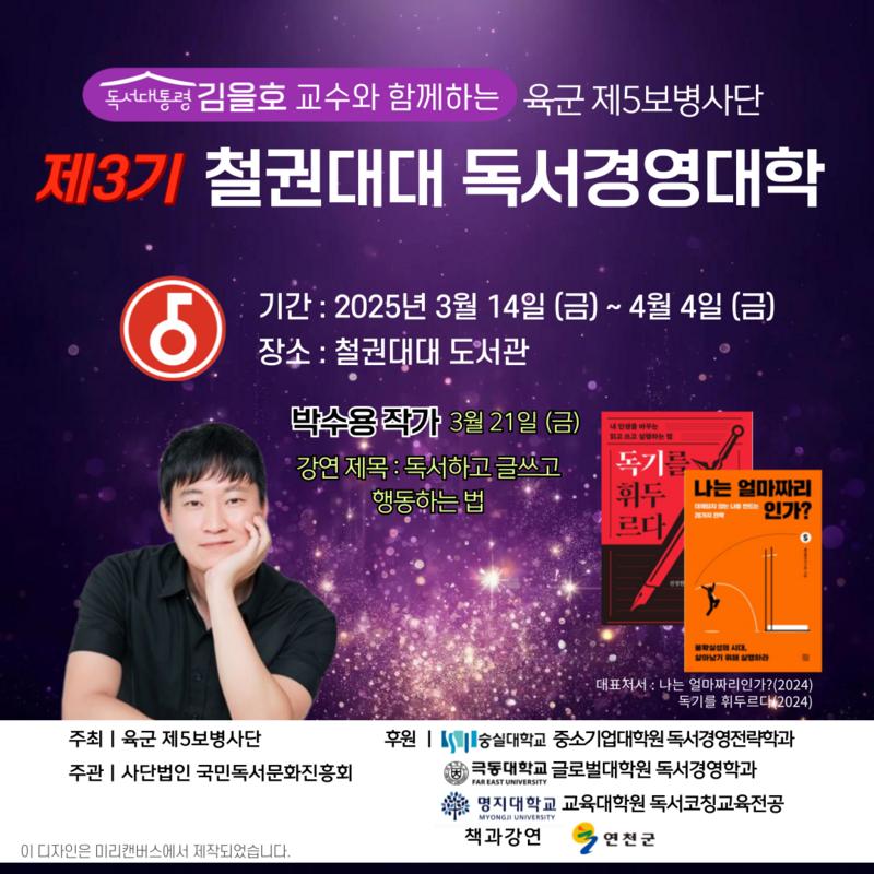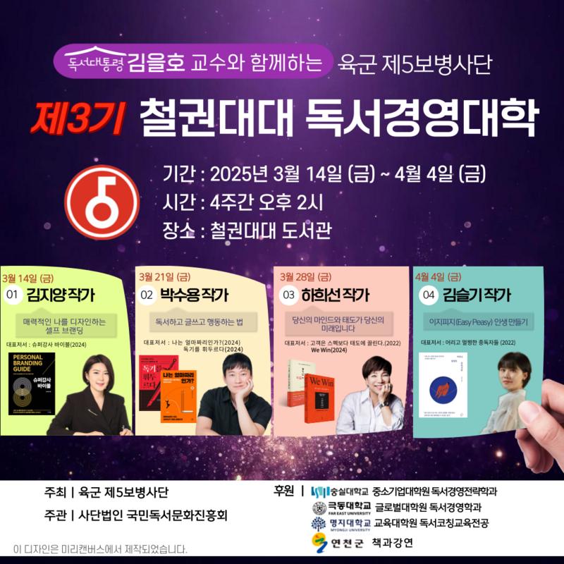 육군 제5보병사단(사단장 윤기중, 이하, 5사단)이 사단법인 국민독서문화진흥회(회장 김을호, 이하, 진흥회)와 함께 개최하는 제3기 철권대대 독서경영대학이 2025년 3월 14일부터 4월 4일까지 4주간 철권대대 도서관에서 진행된다.