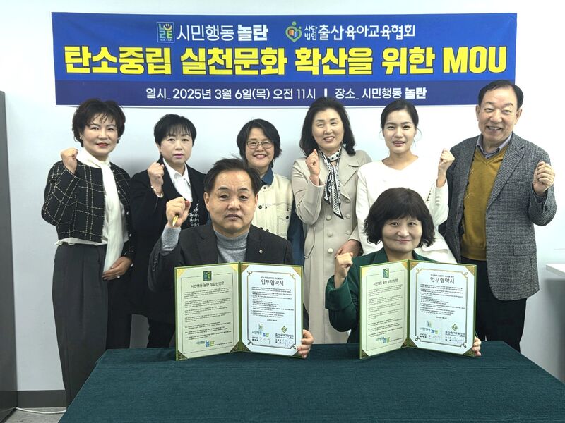 사단법인 출산육아교육협회(이사장 양진)가 탄소중립 실천문화 확산과 지속가능한 출산·육아 환경 조성을 위해 시민행동 놀탄(상임대표 홍석우)과 업무협약(MOU)을 체결했다.