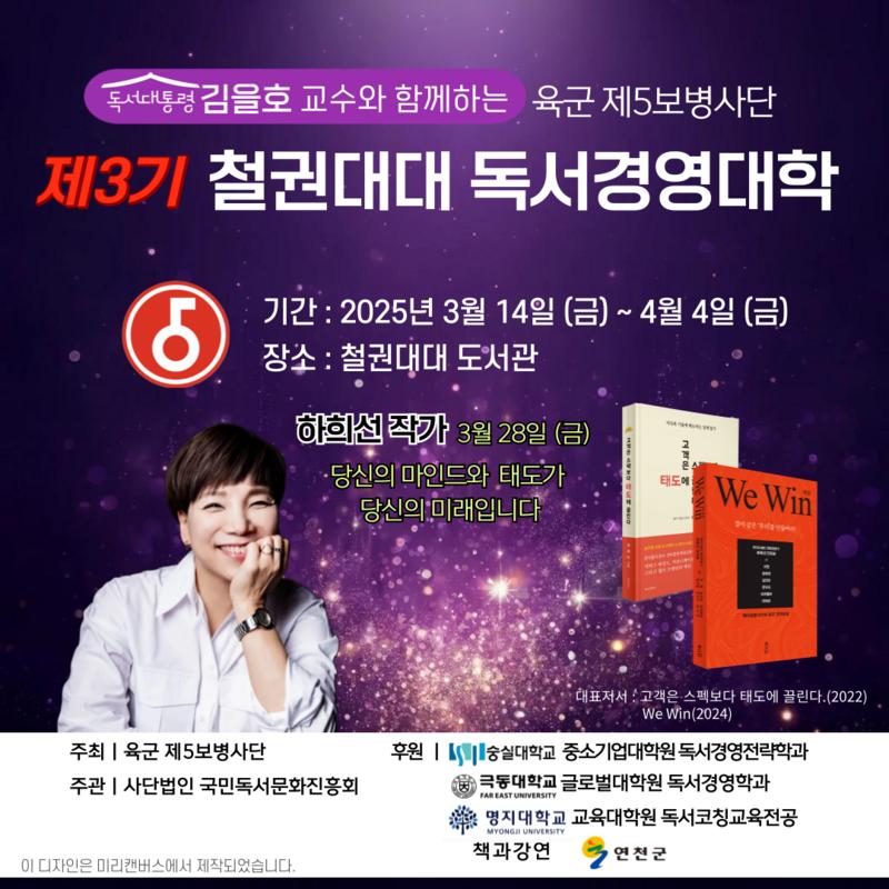 2025년 3월 28일 금요일 오후 2시, 육군 제5보병사단(사단장 윤기중) 철권대대 도서관에서는 사단법인 국민독서문화진흥회와 함께하는 ‘제3기 독서경영대학’ 3차시 특강이 진행됐다. 이날 강연은 다년간 뷰티 교육 현장에서 활동해온 전문 강사이자 저자인 하희선 작가가 맡아 ‘당신의 마인드와 태도가 당신의 미래입니다’를 주제로 열띤 강연을 펼쳤다.