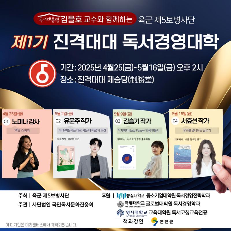 한편, 진격대대 독서경영대학은 5월 16일까지 총 4차시로 운영된다. 5월 2일에는 유윤주 작가가 『마녀(마음먹은 대로 사는 녀석들)의 조건』을 주제로 자신만의 습관을 쌓는 방법을 전할 예정이다.