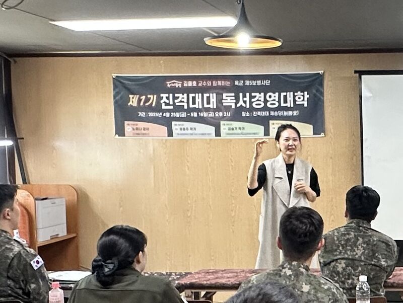 노미나 강사가 제1기 진격대대 독서경영대학에서 열강 중이다.(사진 제공 = 5사단)