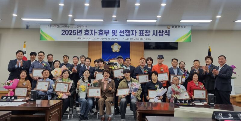 강북구의회(의장 김명희)는 2025년 5월 7일(수), 가정의 달을 맞아 ‘2025년 효자·효부 및 선행자 표창 시상식’을 성황리에 개최했다. 올해로 11년째 이어지고 있는 이 행사는 부모에 대한 효심은 물론, 이웃과 사회를 위한 선행을 실천해온 주민들의 숨은 공로를 기리고 격려하기 위해 마련됐다.