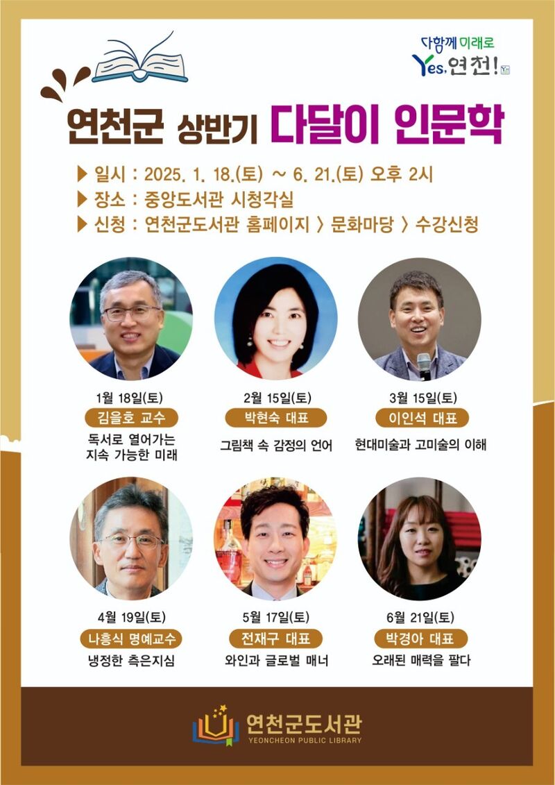 다달이 인문학의 마지막 회차인 6차시 강연은 오는 6월 21일(토) 오후 2시, 동일 장소에서 공예가 박경아 대표를 초청해 자온길 프로젝트의 과정을 소개한 저서의 제목이기도 한 ‘오래된 매력을 팔다’라는 주제로 열린다. 참가를 원하는 군민은 연천군도서관 홈페이지에 접속해 문화마당>수강신청 메뉴를 통해 신청할 수 있으며, 자세한 사항은 독서문화진흥사업 담당자(031-839-4411)에게 문의하면 된다.