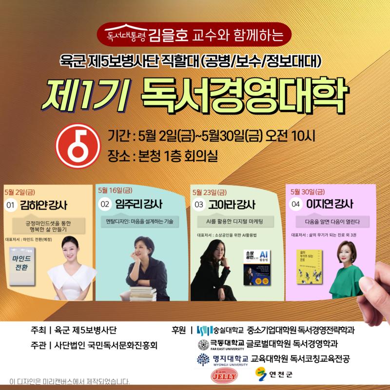 독서경영대학은 5사단과 사단법인 국민독서문화진흥회가 주관하고, 숭실대학교 중소기업대학원 독서경영전략학과, 국동대학교 글로벌대학원 독서경영학과, 명지대학교 교육대학원 교육학과 독서코칭교육전공, 연천군, 아이엠젤리 등의 다양한 후원으로 진행됐다.