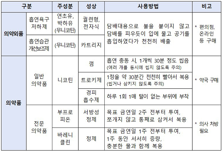 의약품 형태의 금연보조제는 니코틴 금단 증상과 흡연 욕구를 완화하기 위한 용도로 사용된다. 일반의약품에는 껌제, 트로키제(사탕형), 경피흡수제(패치형)가 있으며, 각 제품은 사용 방법에 따라 주의가 필요하다. 껌제와 트로키제는 입안의 점막을 통해 니코틴이 흡수되므로 복용 15분 전부터 커피, 주스, 청량음료 등의 섭취를 피해야 하며, 약물과 함께 복용하지 않아야 한다. 또한 두 제품을 동시에 여러 개 복용하면 니코틴 과다 흡수로 떨림, 혼란, 신경장애 등의 부작용이 발생할 수 있다. 하루 최대 투여량은 껌의 경우 15개, 트로키제는 1밀리그램 기준 25정을 초과해서는 안 된다.
