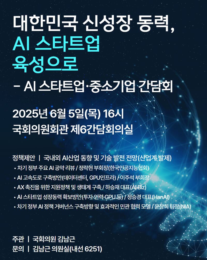 대한민국 신성장 동력, AI 스타트업 육성에 국회 팔 걷어 - AI 스타트업·중소기업 간담회, 6월 5일 국회서 개최