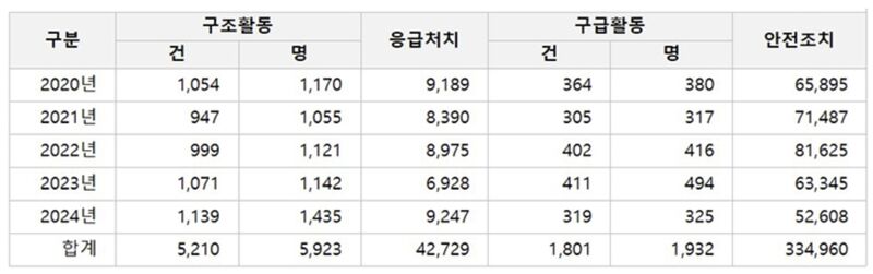 소방청에 따르면 최근 5년간 119시민수상구조대는 5,923명의 시민을 구조하고 4만 2,729건의 현장 응급처치, 33만 4,960건의 안전조치를 실시했다. 그러나 여전히 물놀이 사고의 주요 원인은 구명조끼 미착용, 수영 미숙, 안전수칙 미준수 등으로 나타났다.